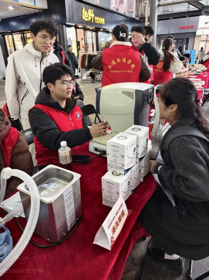 作为学校五星级优秀社团,“光明天使”社团依托眼视光学专业优势,长期深耕眼健康公益志愿服务领域,始终以专业力量守护群众“心灵之窗”。在本次主题公益活动中,志愿服务队精心筹备,活动现场有序开展各项服务工作:志愿者们运用专业设备,为现场居民逐一开展视功能检查、屈光筛查、色觉检测等惠民项目;同时,现场专门设置中药熏蒸体验区,以传统中医护眼方式帮助居民舒缓视疲劳,让大家在家门口就能享受到专业、舒适的眼健康服务。志愿者们以饱满的热情、细致的服务和扎实的专业功底,用实际行动诠释了青年志愿精神,充分展现了金科学子的责任与担当,赢得了现场市民朋友的一致认可与广泛好评。