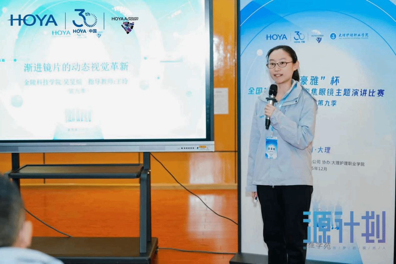 2025年12月3日,由国际知名视光企业豪雅光学主办的“源计划•第九季”——全国视光高校渐变焦眼镜主题演讲比赛,在云南大理护理职业学院顺利落幕。我院2023级视光学子吴旻煊在王玲副教授的专业指导下,作为学院优秀代表,与来自全国其他16所视光高校的选手同台竞技,凭借扎实的专业知识和沉稳的现场表现,圆满完成比赛任务,展现了我院学子良好的专业素养与精神风貌。